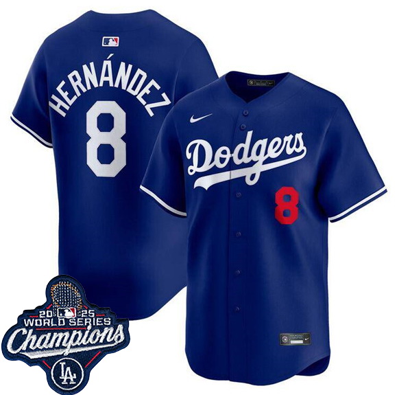 Home>MLB>2025 World Series>Los Angeles Dodgers Champions>Men Los Angeles Dodgers #8 Enrique Hernandez Blue 2025 World Series Champions Patch Home Limited Stitched Baseball Jersey