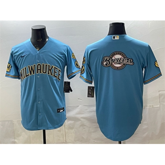 - Men Milwaukee Brewers Blank Blue With Home Bob Uecker Patch Stitched Baseball Jersey